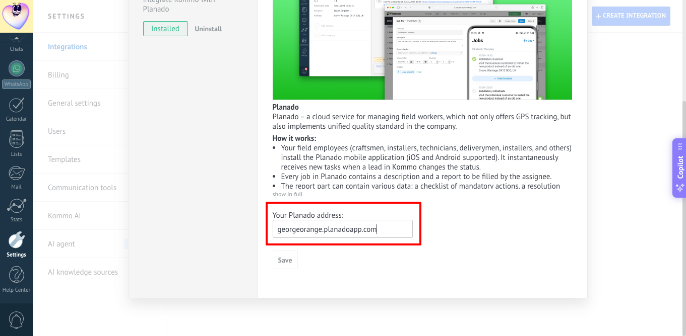 To connect Kommo to Planado, enter your Planado domain address in the "Your Planado address" field at the bottom of the page. It looks like this: <your_domain_name>.planadoapp.com. This is the same domain you chose when registering with Planado. After this, click "Save".