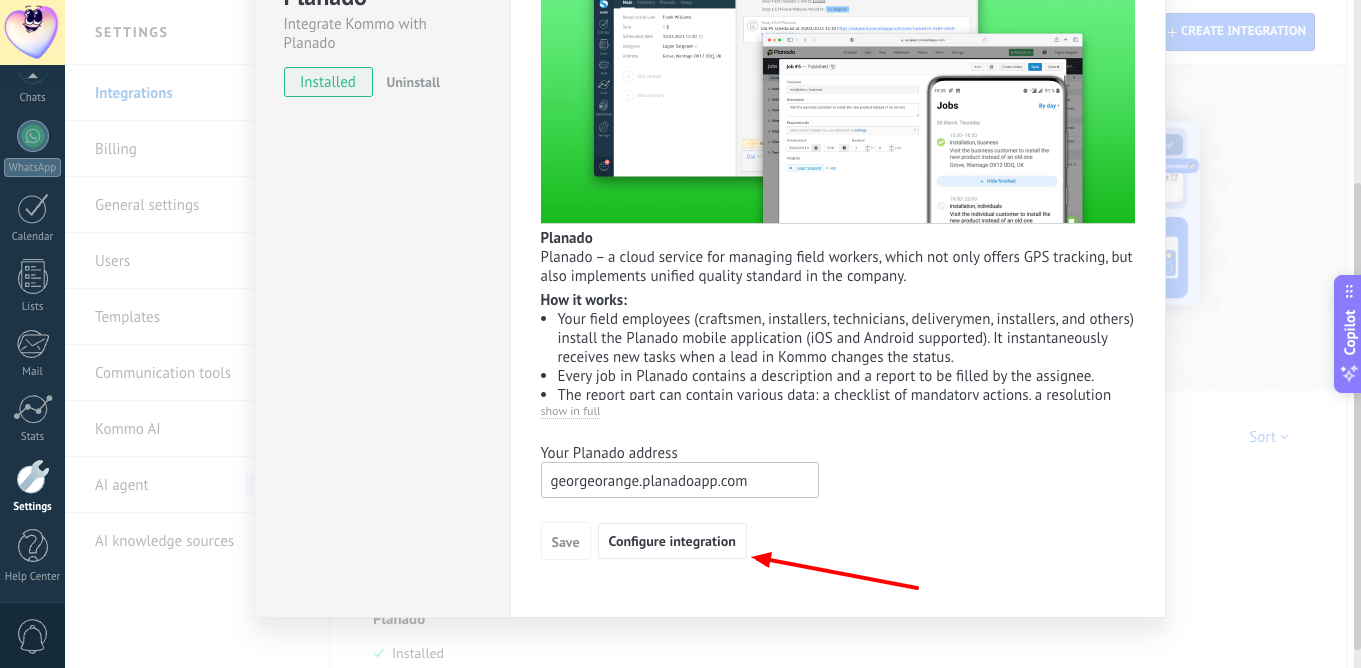 For integration settings, go to Planado. Open the Settings → Integrations → Kommo page.