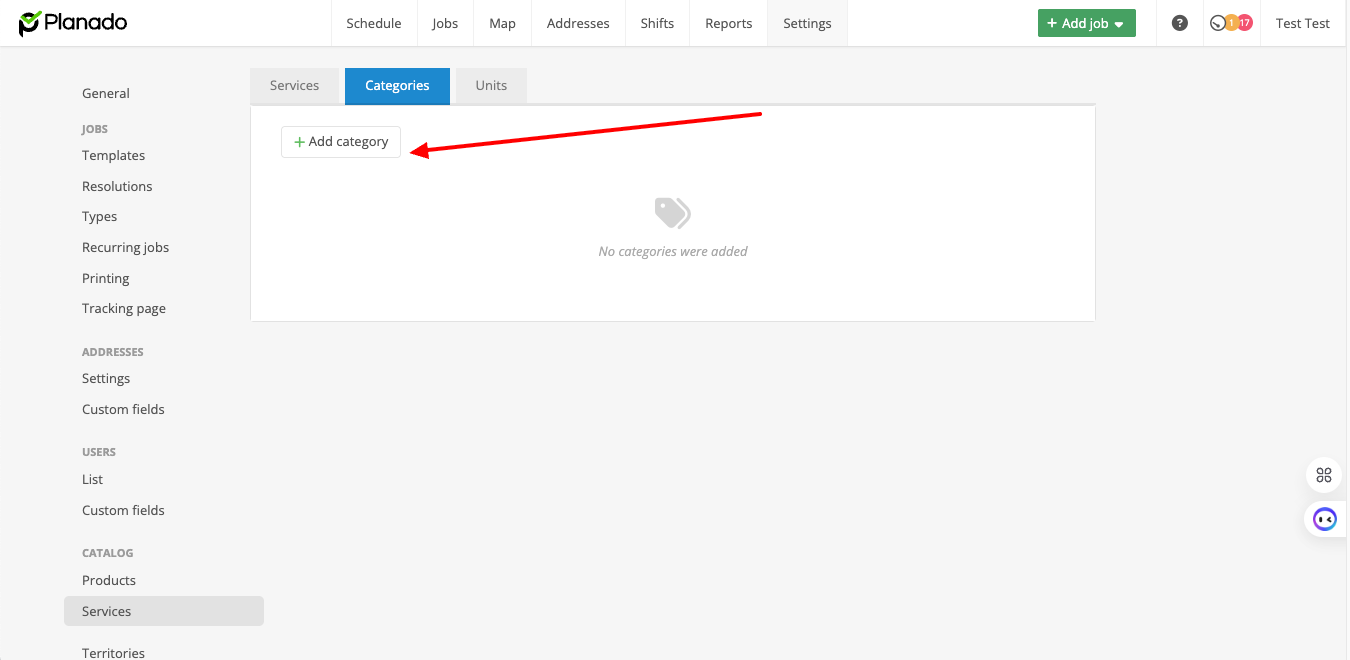 To begin working with services, add categories. Categories help organize services by shared attributes. For instance, you can group repair or additional services under specific categories. Additionally, a category can be linked to a job template, ensuring all services within that category become accessible in the template.