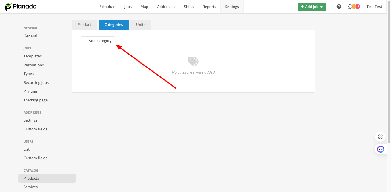 To create a new category, navigate to Settings → Products and select the Categories tab. Then, click on the Add category button.