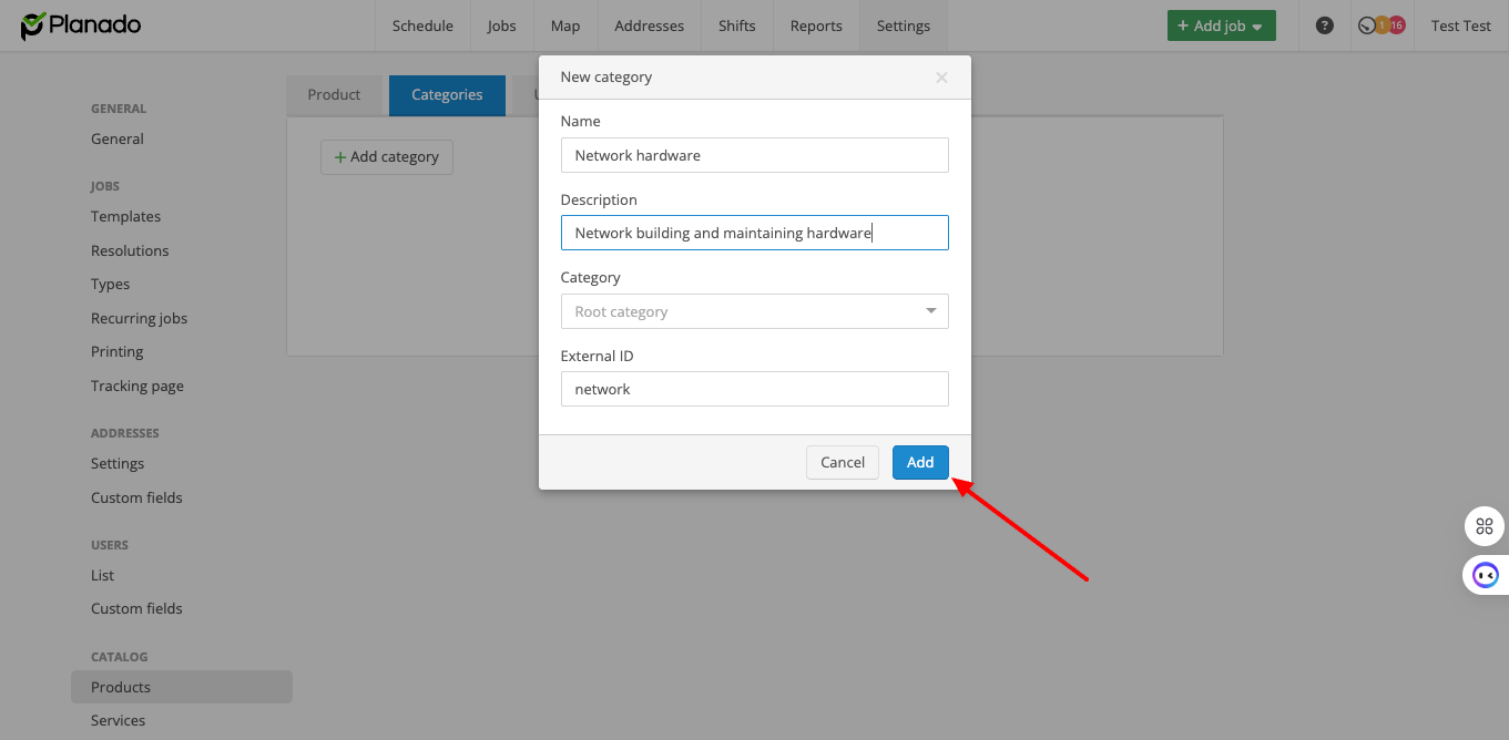 In the new category window, enter the category details such as name, description, and external ID. If it's not the primary category, you can choose a parent category. Once completed, click the Add button to save.