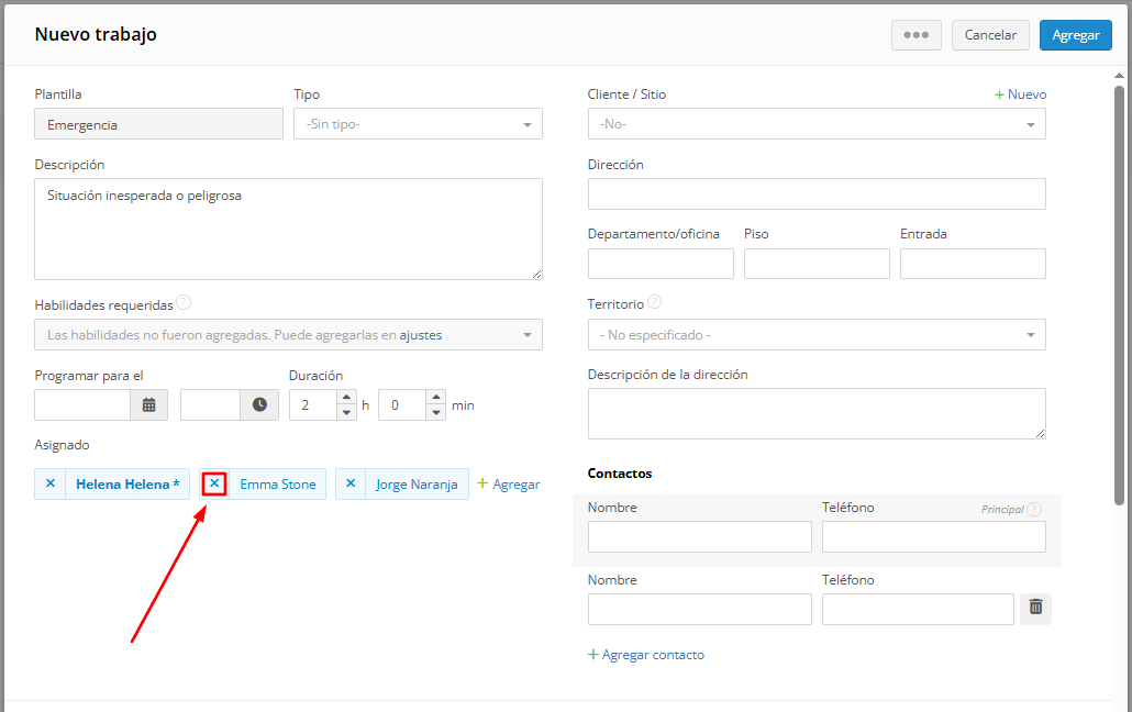 Para eliminar un empleado del trabajo, haga clic en la cruz junto al nombre del empleado.