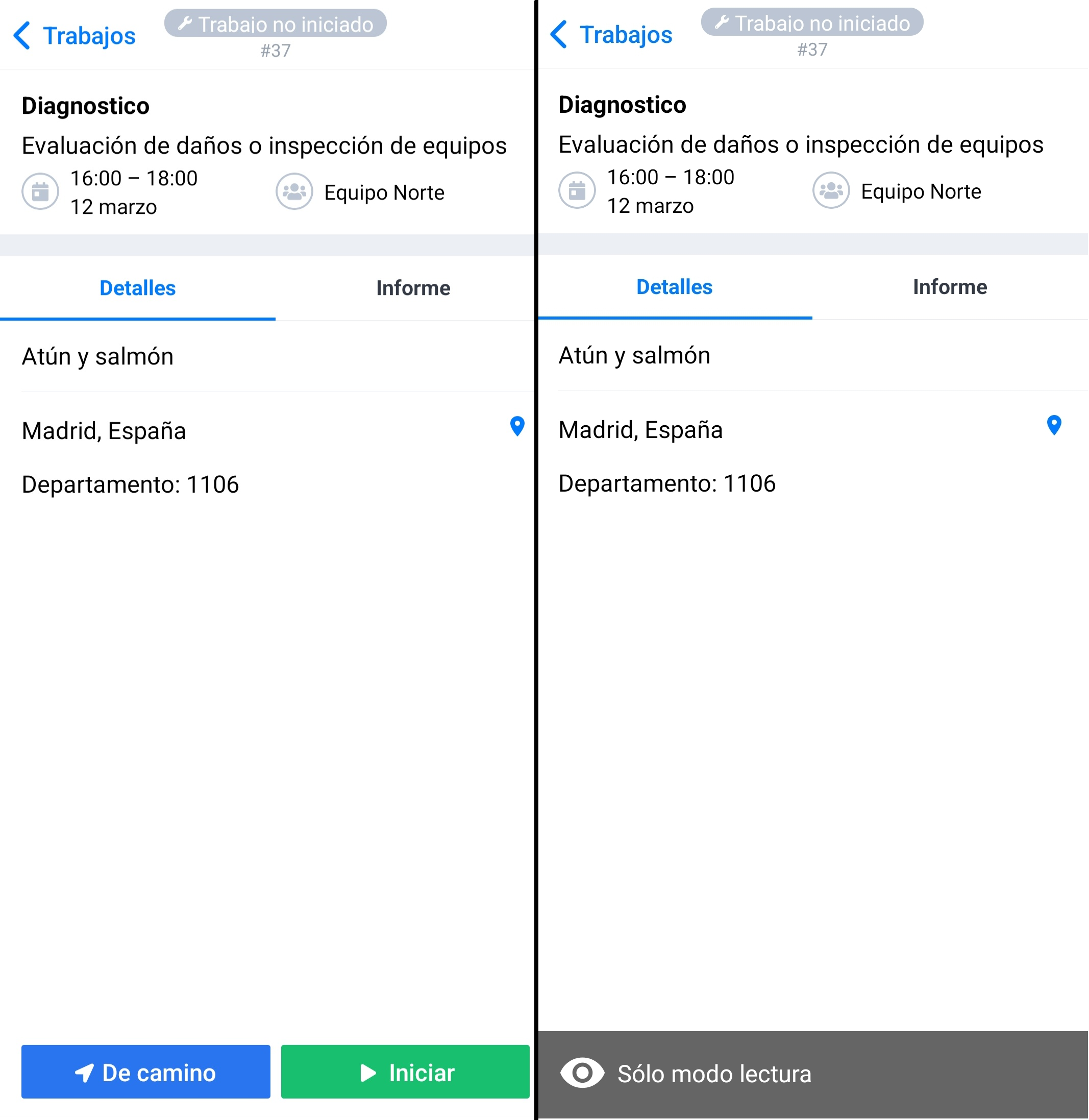 Si un empleado es parte del equipo, podrá ver el trabajo en la aplicación móvil, pero no podrá realizar modificaciones (ver captura de pantalla a la derecha).