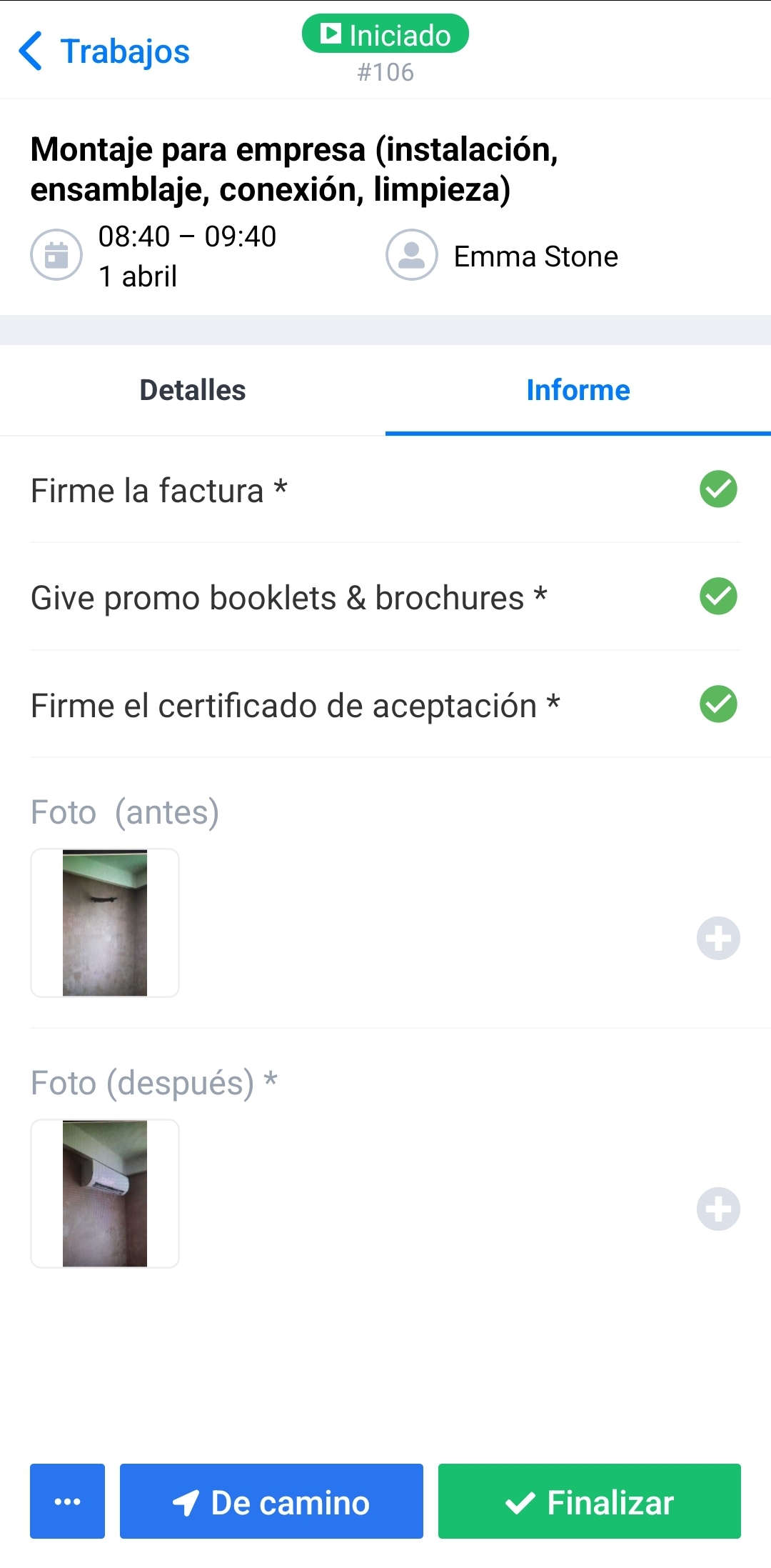 Redacta el informe del trabajo y marca como obligatorios todos los puntos importantes. Los campos obligatorios del informe están señalados con un asterisco (*). El empleado no podrá omitir ninguna etapa del trabajo: para finalizarlo con éxito, deberá completar todos los puntos de la lista.