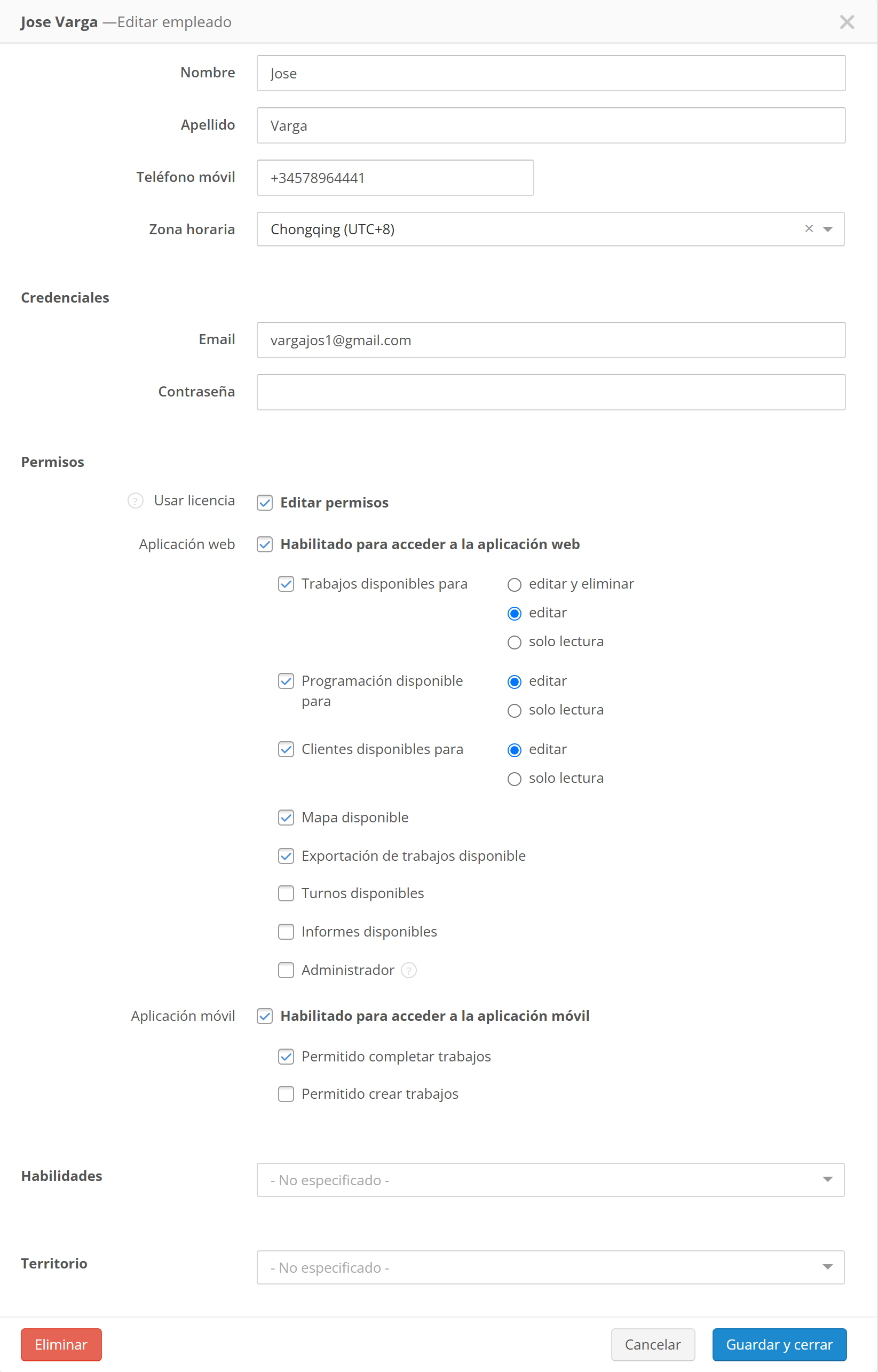Se abrirá el menú de edición del empleado. Además de los datos principales, podrás agregar los derechos del empleado en el campo Habilidades.