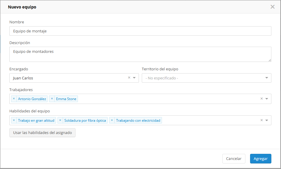 Haz clic en el campo Habilidades del equipo y podrás seleccionar cualquiera de las habilidades disponibles o hacer clic en el botón Usar las habilidades del asignado para completar automáticamente el campo con todas las habilidades que tengan los empleados en el campo Trabajadores.