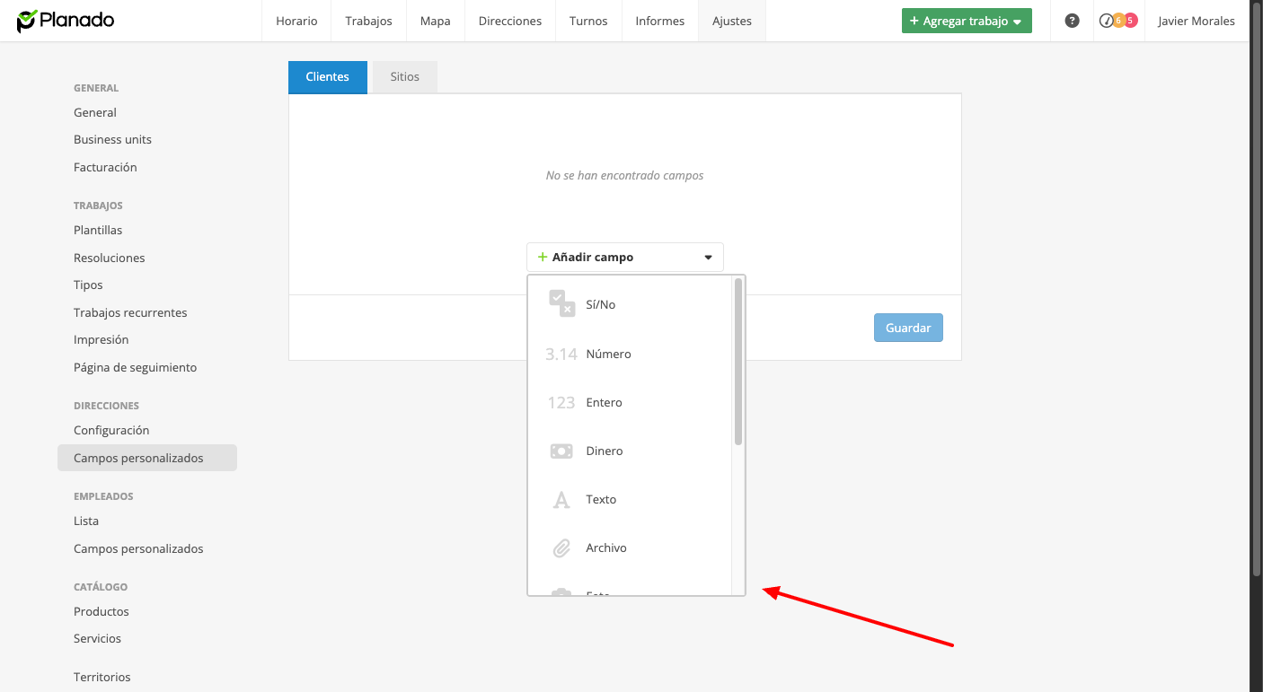 Planado permite agregar campos personalizados para clientes y sitios. En ellos puedes guardar información que no encaje en los campos estándar de clientes y sitios. Por ejemplo, puedes almacenar documentos relacionados con un cliente o un sitio en los campos personalizados.