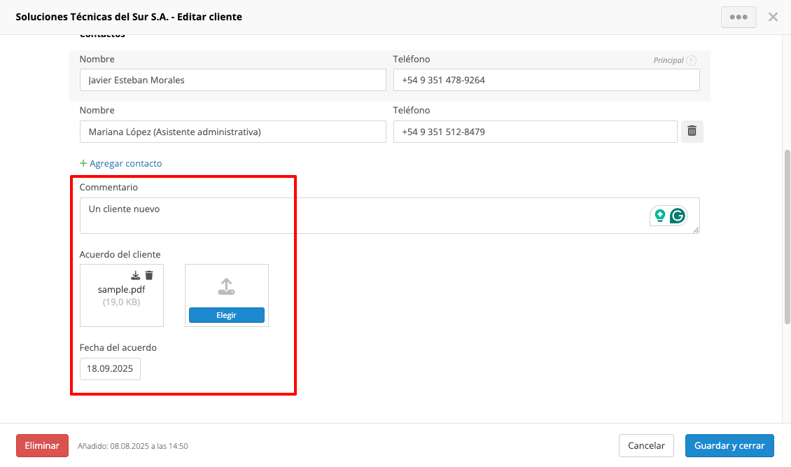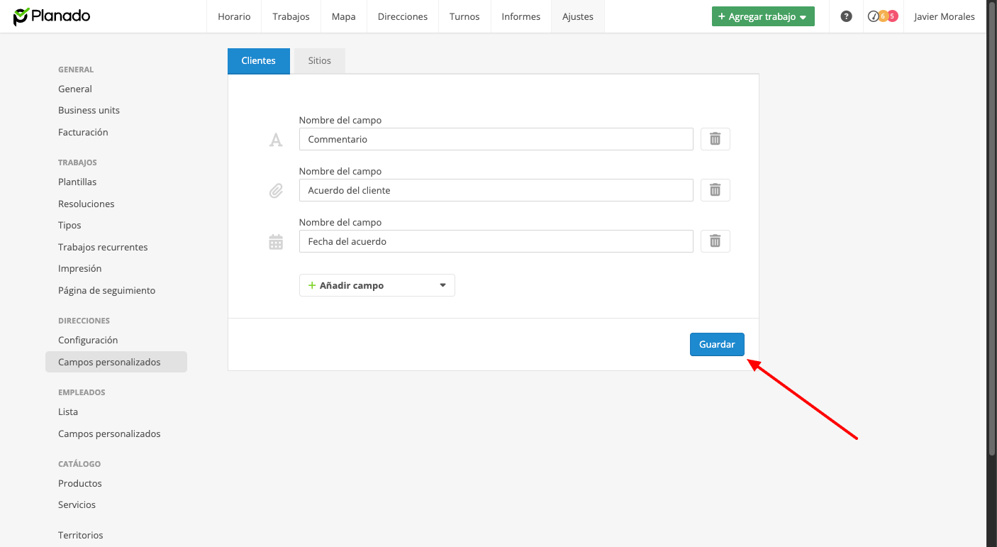 Después de guardar los campos, estos aparecerán en tus clientes o sitios.