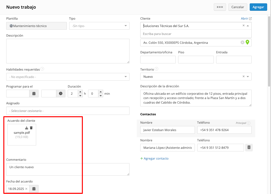Campos personalizados del cliente en un trabajo