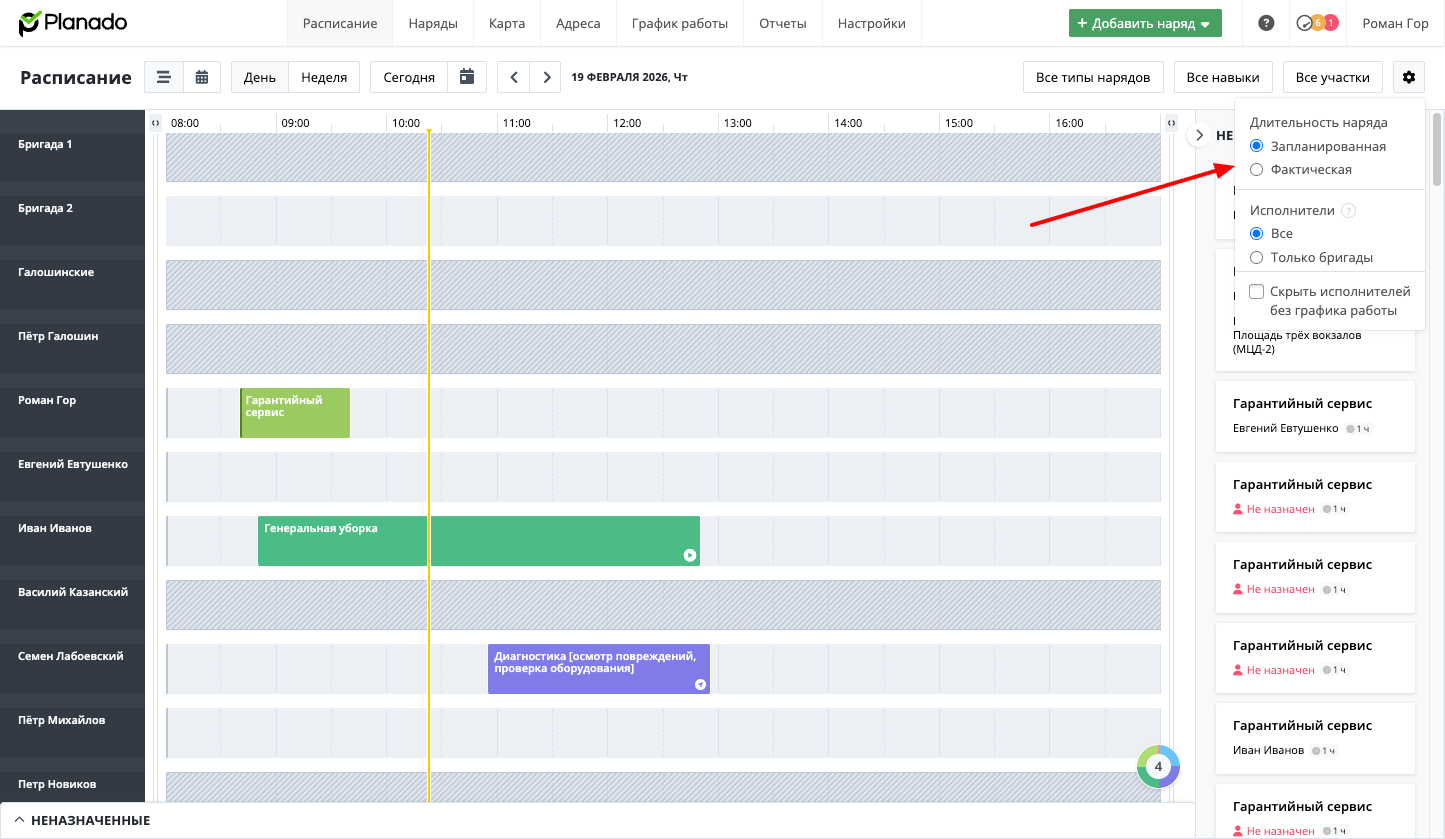По умолчанию наряды отображаются со своей запланированной длительностью. Вместо неё вы можете использовать фактическую длительность нарядов. Переключиться на запланированную длительность можно с помощью настроек расписания в правом верхнем углу.