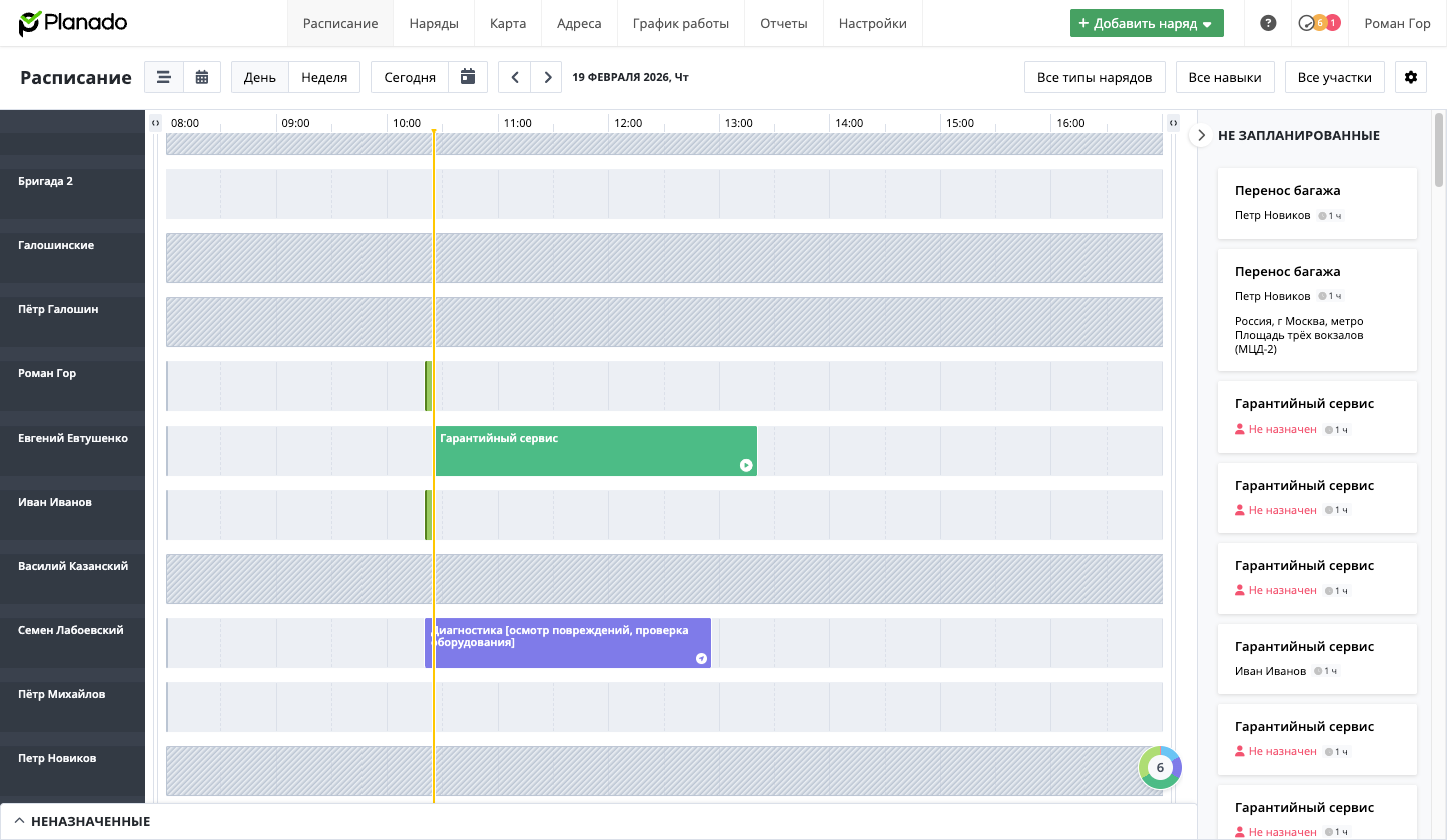 Диспетчер может визуально определить загруженность сотрудников в течение дня или недели, создавать и распределять наряды, менять исполнителей, время и дату нарядов.