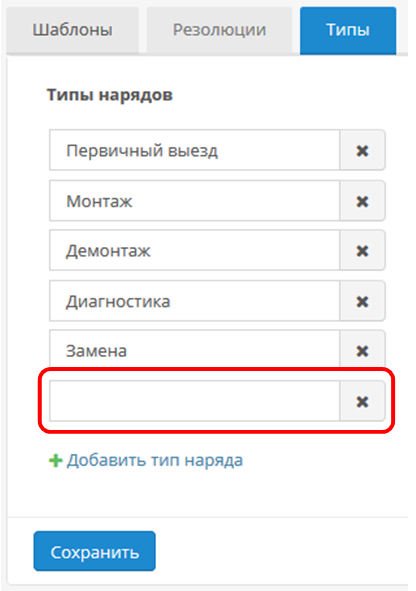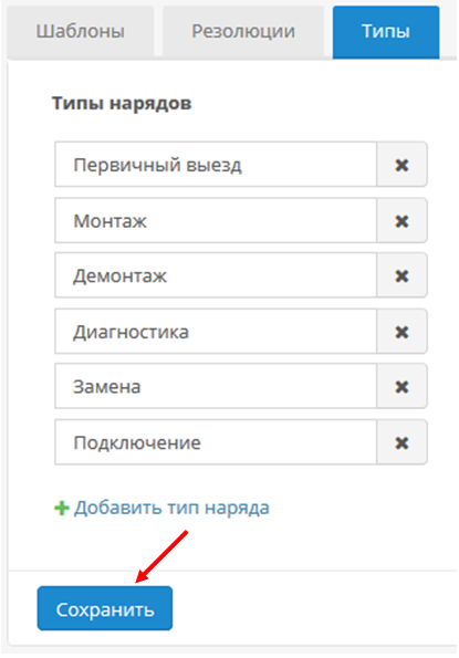Чтобы добавить новый тип, откройте страницу Настройки → Наряды → Типы. Создайте новый тип нажатием на кнопку «Добавить тип наряда».